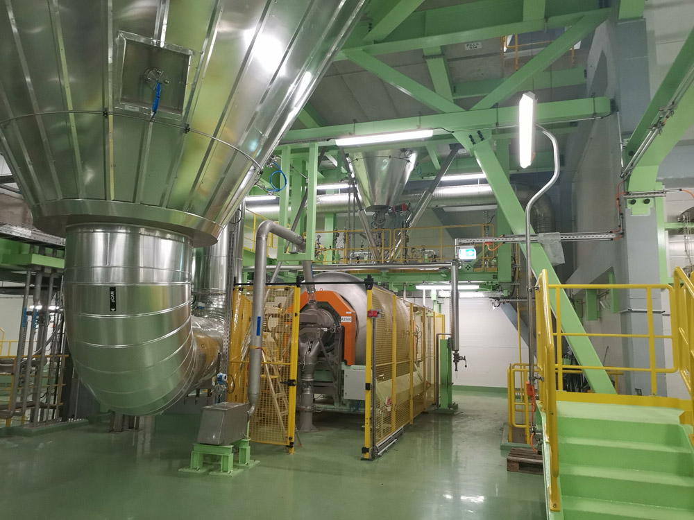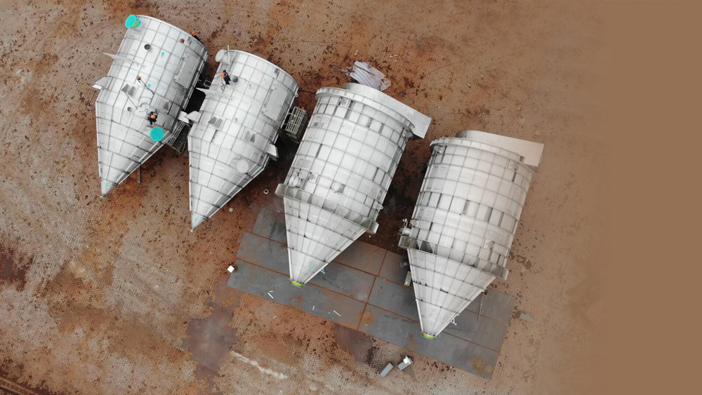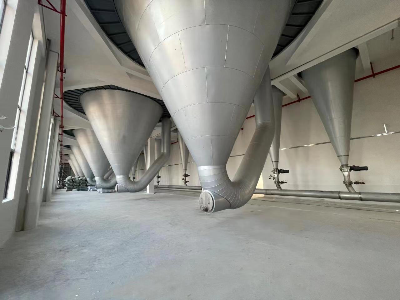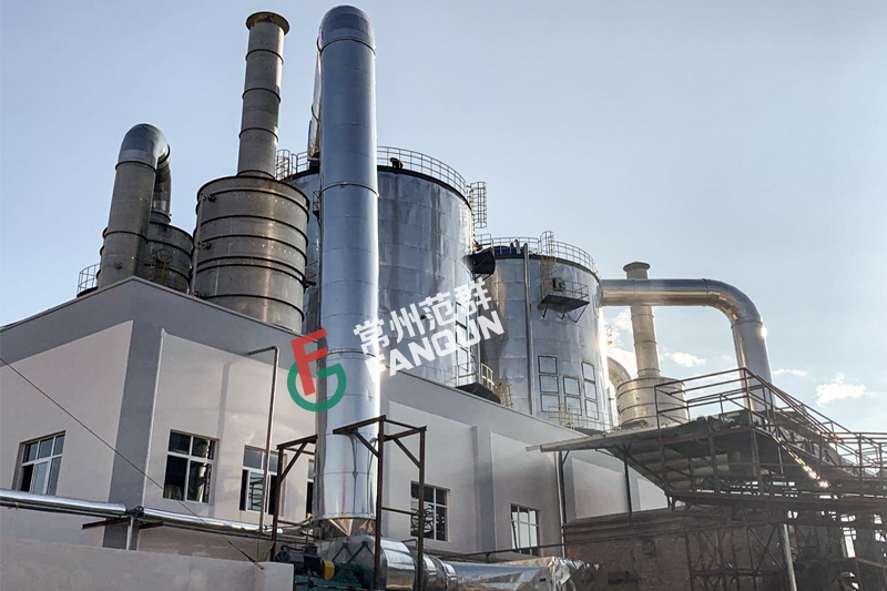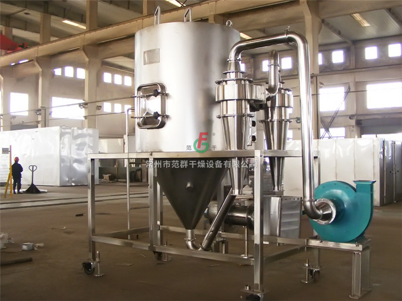 空气通过加热器转化为热空气,进入装置在干燥室顶部的热风分配器,然后均匀的进入干燥室,同时通过无级调速的螺杆泵将料液送至装置在干燥室顶部的离心雾化器,使料液雾化成极小的雾化液滴,料液和热空气并流接触,水份迅速蒸发在极短的时间内干燥为成品,成品经干燥塔底部和旋风分离器排出,废气由风机抽出排空。